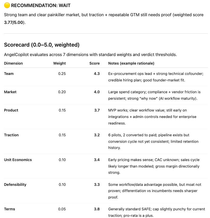 For evaluating deals, AngelCopilot uses a 7-factor rubric based on: