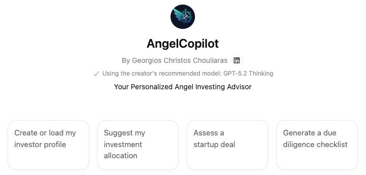 AngelCopilot is an assistant I built to give more structure to my angel investing. It started from a carefully curated prompt, and I turned it into a custom GPT so that others can use it as well. I’m sharing it publicly in case it’s useful to others who want a more repeatable way to evaluate deals. You can access it here.
